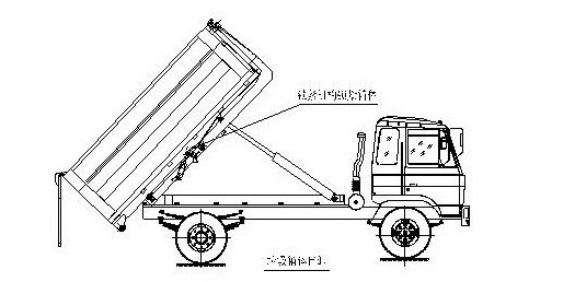 步驟3.當(dāng)拉臂鉤鉤到箱體彎鉤時(shí),繼續(xù)推下拉臂操作手柄到落下位置,使垃圾箱體繼續(xù)上車(chē)(注意:保證垃圾箱體的縱梁位于附車(chē)架尾部?jī)珊鬂L輪之間);如圖: