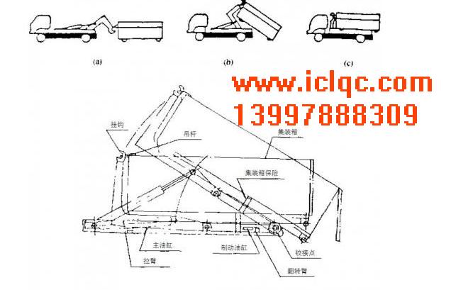 鉤臂式垃圾車通過鉤臂架裝置完成兩種不同的功能動作:換箱和傾卸。