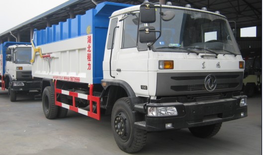 該車主要用于城鄉(xiāng)垃圾壓縮站的垃圾清運。垃圾壓縮站對垃圾進行收集、壓縮后將箱體垂直舉起,并打開壓縮箱排泄門,這時垃圾車箱體后門向上旋轉開啟,垃圾車后門與壓縮箱后門對接,之后垃圾塊被壓縮箱內的推板水平推進到垃圾車箱體內,完成垃圾裝載后關閉垃圾車后門,將垃圾運到垃圾處理地進行傾卸。該車由液壓控制系統(tǒng)來完成該車的后門的開啟和關閉及自卸功能,降低了工人的勞動強度和改善了工作環(huán)境。該垃圾車的收運方式是目前國內廣泛采用的垃圾壓縮站垃圾轉運方式,可以實現(xiàn)一車多站,大大降低了配備成本和空間等等;其專用裝置的功能均以汽車發(fā)動機為動力,通過液壓機構手動或電控、氣控來實現(xiàn)。車輛的箱體采用優(yōu)質炭鋼板全密封焊接結構,具有強度高、重量輕,不產生二次污染等優(yōu)點。