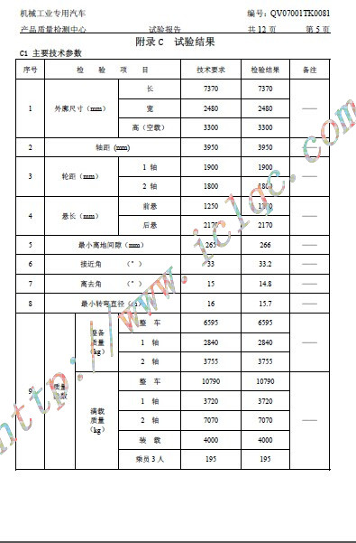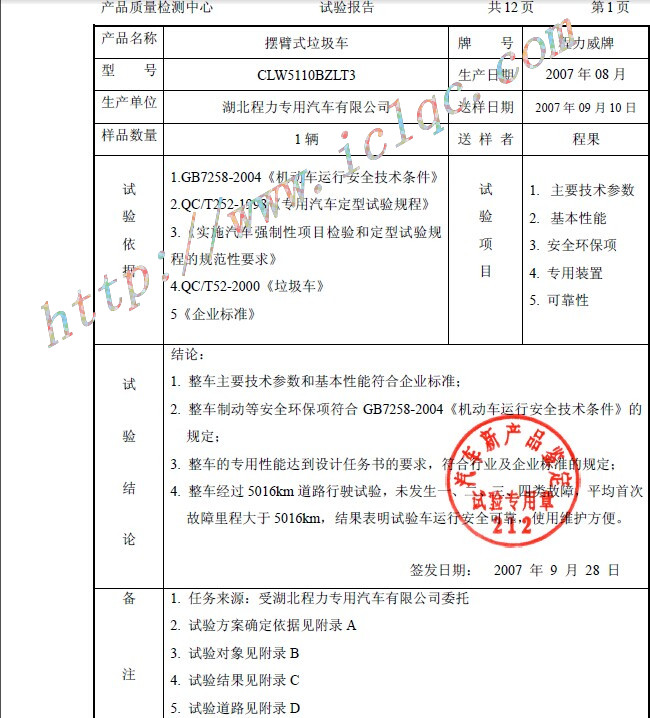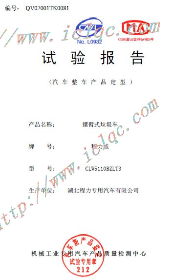 程力環(huán)衛(wèi)垃圾車CLW510BZLT3B擺臂垃圾車的檢測報告: