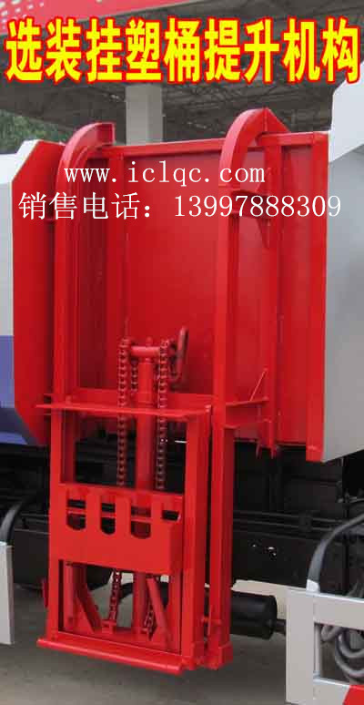 環(huán)衛(wèi)垃圾車東風(fēng)145掛桶式垃圾車自裝料裝置:自裝料裝置設(shè)在箱體的前部側(cè)面,由支架、油缸、鏈條結(jié)構(gòu)、吊鉤等組成。此裝置可將外部垃圾桶內(nèi)的垃圾提升裝入箱體內(nèi)。