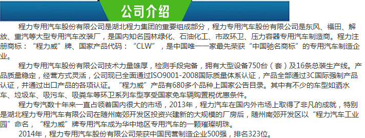 程力專用汽車股份有限公司(http://www.iiq8.cn)國家知名園林綠化,市政環(huán)衛(wèi)專用汽車制造廠家,專業(yè)生產(chǎn):環(huán)衛(wèi)垃圾車,多功能灑水車,吸污(糞)車,清障車等專用車系列,歡迎來電咨詢環(huán)衛(wèi)垃圾車價(jià)格,灑水車價(jià)格等。銷售電話:13997888309 聯(lián)系人:戈經(jīng)理