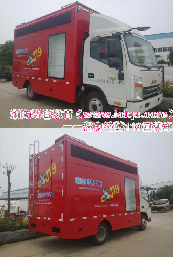 宣傳消防知識(shí)的宣傳車——底盤采用的是江淮公司的原裝底盤,車箱裝有LED高清屏和滾軸屏的來進(jìn)行消防知識(shí)的宣傳,箱體內(nèi)部安裝有電腦配置的請(qǐng)音通過車箱側(cè)面裝的公放里面播放出消防知識(shí)。車身貼有消防科普知識(shí)的圖片及配有緊急情況時(shí)應(yīng)拔打119電話的圖標(biāo)。整車設(shè)計(jì)大氣,美觀,不學(xué)習(xí)漏掉任何一個(gè)宣傳的機(jī)會(huì)。