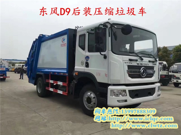 三、東風(fēng)D9后裝壓縮垃圾車,整車型號為CLW5181ZYSE5,底盤型號EQ1181LJ9BDE,總質(zhì)量18噸,額定質(zhì)量8.1噸,整備質(zhì)量9.7噸,4500mm軸距,康明斯210馬力國五發(fā)動(dòng),10.00R20鋼絲胎。該款壓縮垃圾車的容積為10噸,后垃圾裝載樣式可以選裝三角斗裝置、掛桶裝置、擺臂裝置、大落地斗裝置、無后翻轉(zhuǎn)裝置。