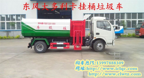 四、東風(fēng)大多利卡掛桶垃圾車,整車型號為CLW5080ZZZT5,底盤型號EQ1082GLJ2,總質(zhì)量8250kg,整備質(zhì)量4330kg,額定質(zhì)量3725kg,3300mm軸距,朝柴151馬力國五發(fā)動(dòng)機(jī),7.50-16LT輪胎。該款掛桶垃圾車屬于自裝卸式垃圾車,側(cè)面帶掛桶提升機(jī)構(gòu),垃圾桶可選擇120L或240L的鐵桶或塑料桶。