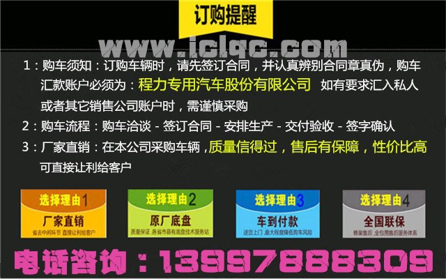 程力專用汽車改裝廠歡迎各位新、老朋友惠顧,并期待著您的光臨。同時(shí),我公司可憑貴單位的責(zé)任傳真,或預(yù)付部分車款后,優(yōu)惠辦理送車業(yè)務(wù);到我公司提車,我公司為您代辦全套行車手續(xù)。