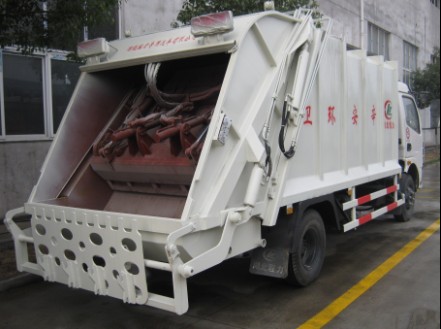 ![]() 圖1后置壓縮式垃圾車。 將垃圾倒入垃圾斗里,再通過刮板將垃圾刮進廂體進行壓縮