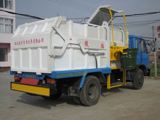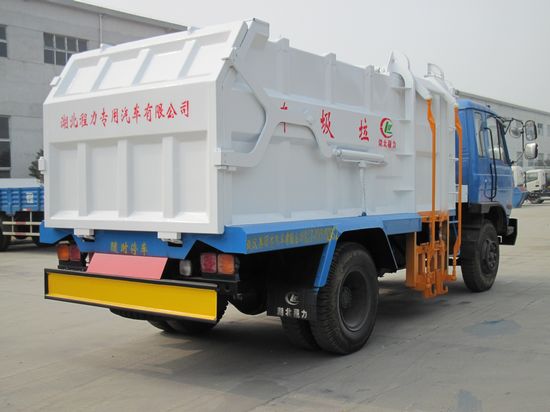 湖北程力生產(chǎn)的壓縮帶掛桶式垃圾車側(cè)面整車照片(側(cè)面是掛桶鉤)
