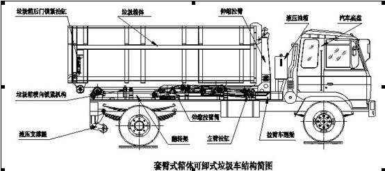 一、環(huán)衛(wèi)垃圾車程車箱可卸(拉臂)式垃圾車(套臂式)使用說明書結(jié)構(gòu)簡圖